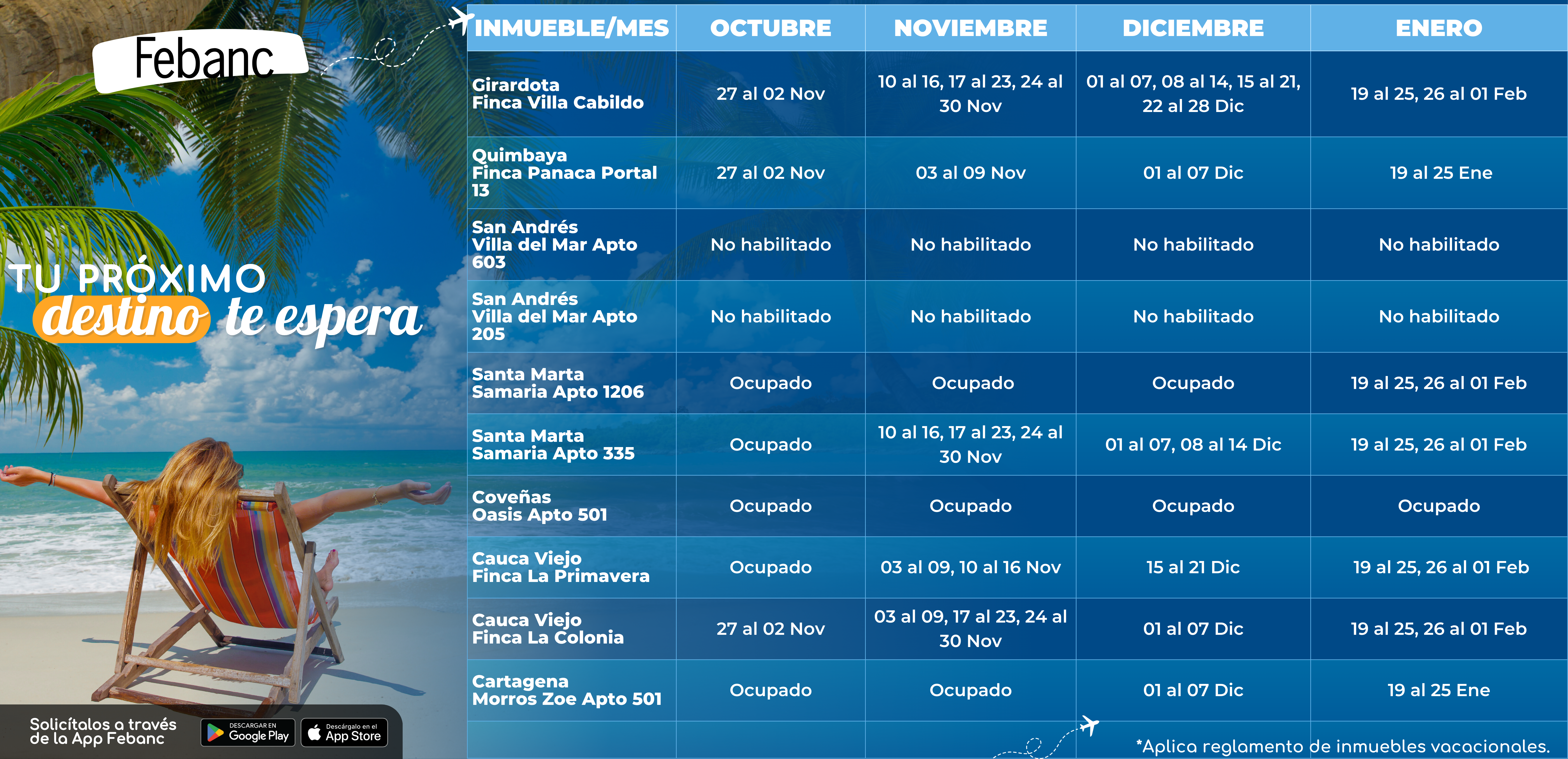 Conoce las fechas disponibles en nuestros inmuebles vacacionales y planea tus próximas vacaciones.